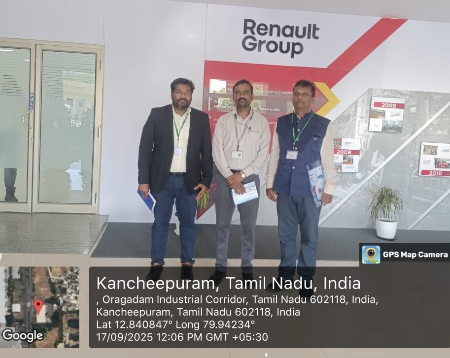 A visit was made to the manufacturing facility of Renault Nissan Automotive Pvt. Ltd., Chennai, where an interaction was held with Mr. Paulraj, Head – HR. During the discussion, the strengths, location, and student profile of our college were presented. The company expressed its willingness to offer opportunities for student internships, industrial visits, and placement-related activities. Mr. Paulraj also accepted an invitation to visit our campus for an interaction session with students. The team appreciated our institution’s proactive initiatives in building strong industry–academia partnerships.